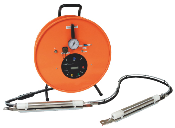 双探头接收系统(DDS:Dual Downhole System)适用于在干井或充水孔中接收P波和S波,进而获得层速度。DDS由两个三分量检波器组成。两个检波器之间机械连接,确保相应的传感器方位一致。两个检波器都通过电动充气气囊与孔壁实现耦合,空气经由凯芙拉材质的混合缆注入DDS。可显示相对正北方方位角偏差的磁性罗盘,用以确定DDS在孔中的定向。电缆终端的接头用于直接与地震仪连接。
