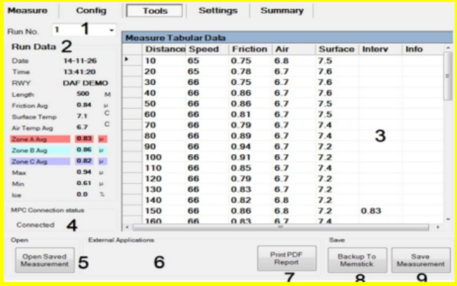 所有测试的结果可以按照表格的形式通过软件进行浏览生成PDF格式的报告,或导出到Excel或其他数据分析软件进行处理。软件可以自动计算《国际民用航空公约》要求的跑道A段,B段和C段的摩擦系数,显示摩擦系数的最大值和最小值。