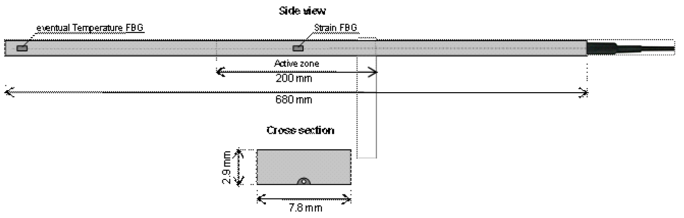 SMARTprofile应变计由敏感段和迟钝段光纤组成。敏感段包含嵌入一个或两个FBG (第二个用于温度测量和补偿)的复合材料传感贴片。包含可选的FBG温度传感器的金属管也嵌入在同一个贴片中。敏感段的长度即为应变计的标准或基准长度。迟钝段由互连光缆和接头组成。可以链接多达4个这样的传感器以形成单个传感阵列。温度传感器只能安装在传感器链的终端传感器中。带有内置保护盖的标准E-2000接头用来把传感器与读数仪或延长光缆连接起来。