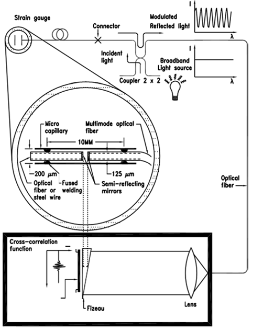 FOS光纤应变计,也叫法布里-珀罗应变计,基于使用普通多模光纤的白光干涉原理,它是围绕法布里-珀罗干涉仪(FPI)而设计的。法布里-珀罗腔是由两根直径为125微米的纤维相对而成,并融合在直径为200微米的玻璃微毛细管中,每根光纤的端面都有一层半反射镜涂层。然后,将传递到应变计的应变变化转换为空腔长度的变化。法布里-珀罗腔的长度与光纤上两个熔接点之间距离的比值,确定了应变计的量程,而应变计的灵敏度则由读数仪中使用的光电二极管阵列的密度决定。把应变计粘贴到试件上之后,用读数仪把传递到应变计上的应变转换成单位为工程单位的测量结果。