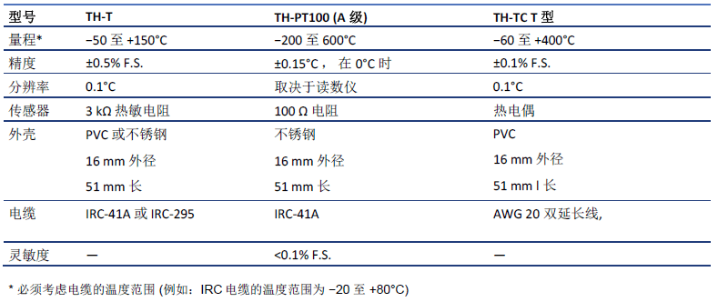 温度传感器有三种不同的型号可供选择:TH-T,TH-PT100和TH-TC。