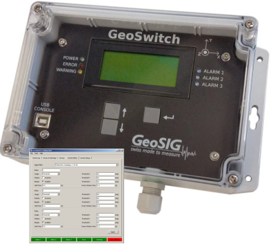 GeoSwitch提供了一套完整的地震开关系统,包括构成GeoSIG RQM™格式的四个坚固的三轴加速度计,一个适用于多达三个独立开关水平的数字阈值检测电路,输出继电器,以及备用电源。