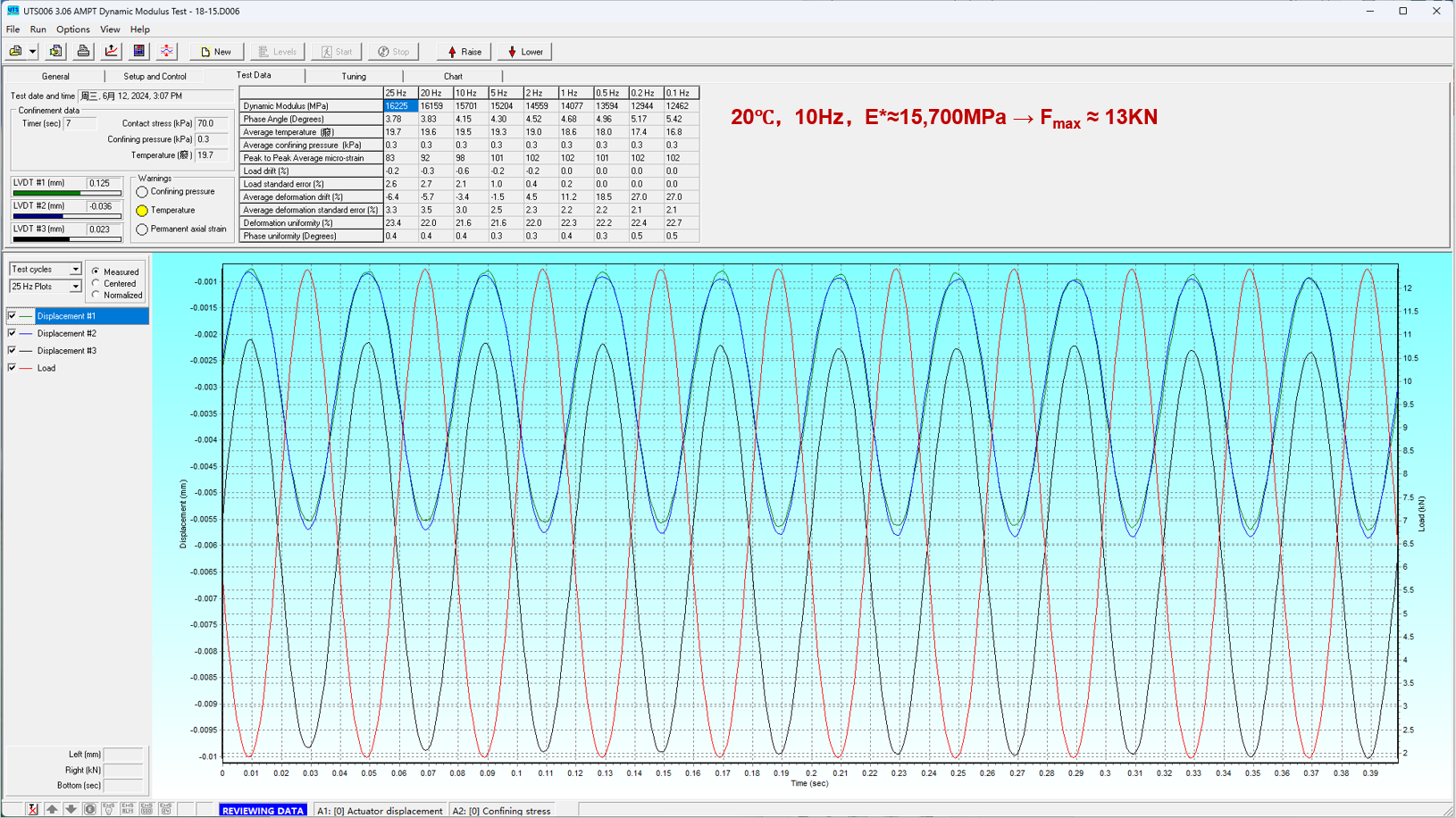 图2是常用的单轴压缩动态模量的试验结果示例,在20℃和10Hz条件下,测试样品高模量沥青混合料的结果约为15,700MPa。