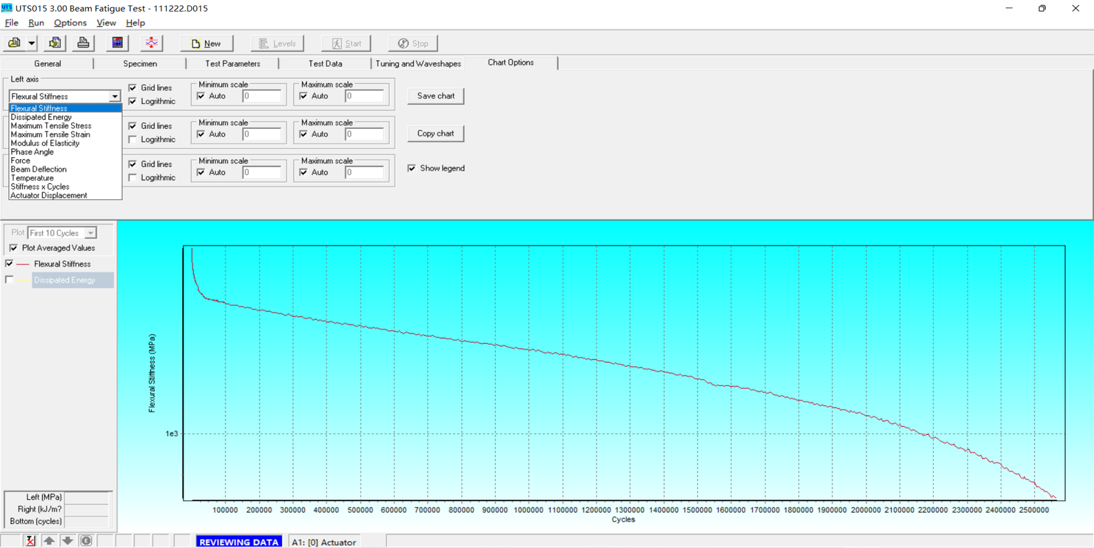 软件能够控制系统自动完成频率扫描,计算每个频率对应的动态模量,相位角等指标,并计算各种误差指标,对试验结果的质量进行控制。测试结果以表格的形式显示,并绘制成曲线实时显示;用户还可以将测试结果到处为.csv格式的文件,使用Excel等第三方程序进行后处理;或是导出符合FHWA发布的FlexMAT程序要求格式的数据来绘制动态模量主曲线。