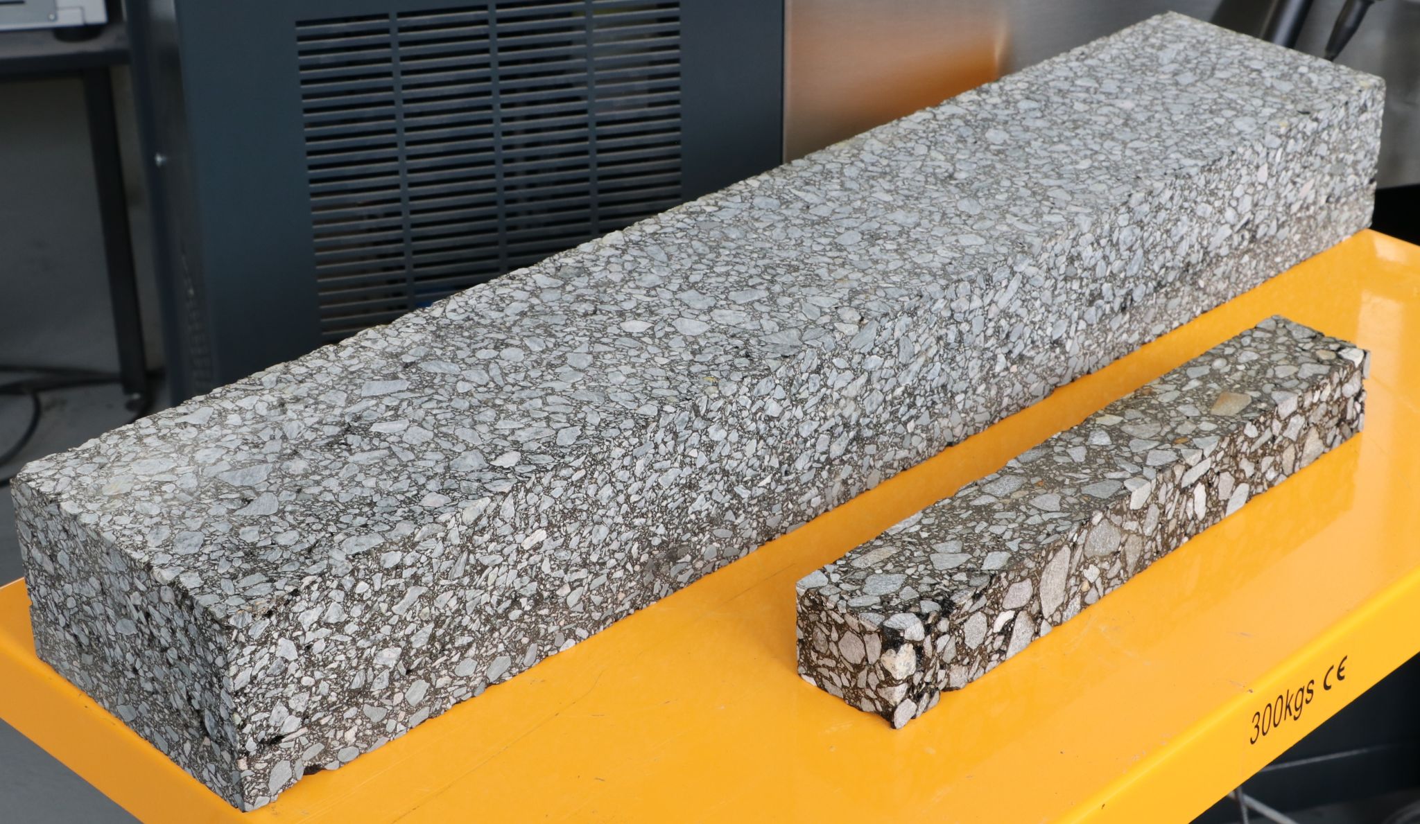 UTM-130XL是最早针对波兰用户需求开发的一款宽体结构的超大型设备,主要用于大尺寸复合结构梁型试件的疲劳试验,也可以按照我国的钢桥面技术规范开展五点弯曲疲劳试验。下图即为试件尺寸的对比,大型试件的尺寸可达:高160×宽200×长790mm;对比的小型试件为标准的四点小梁试件(50×63.5×380mm)。