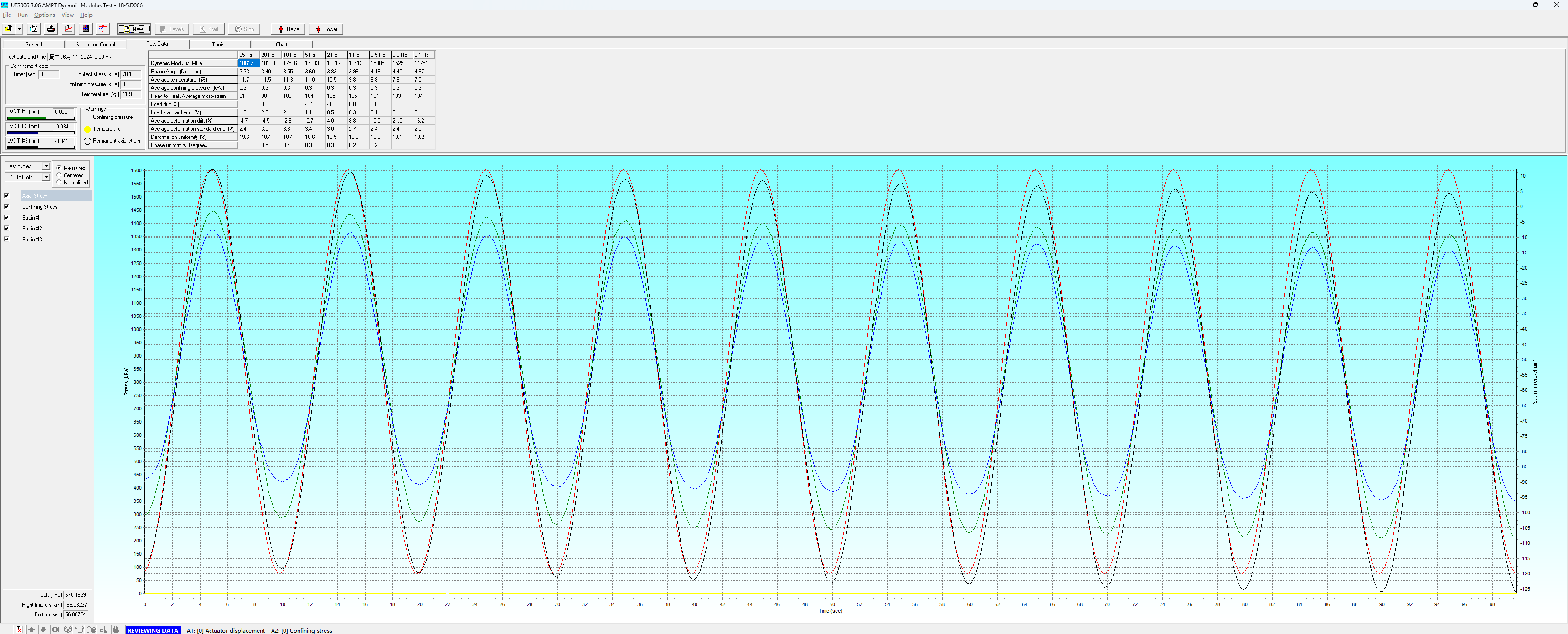 图3是常用的单轴压缩动态模量的试验结果示例,软件能够控制系统自动完成频率扫描,计算每个频率对应的动态模量,相位角等指标,并计算各种误差指标,对试验结果的质量进行控制。测试结果以表格的形式显示,并绘制成曲线实时显示;用户还可以将测试结果到处为.csv格式的文件,使用Excel等第三方程序进行后处理;或是导出符合FHWA发布的FlexMAT程序要求格式的数据来绘制动态模量主曲线。