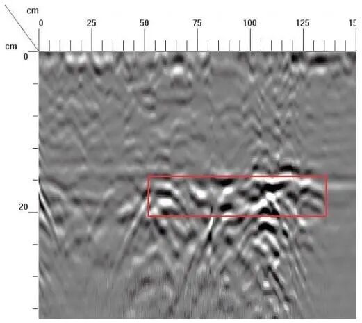 横坐标50~125cm,深度16~21cm位置存在砖墙间脱空、空洞。