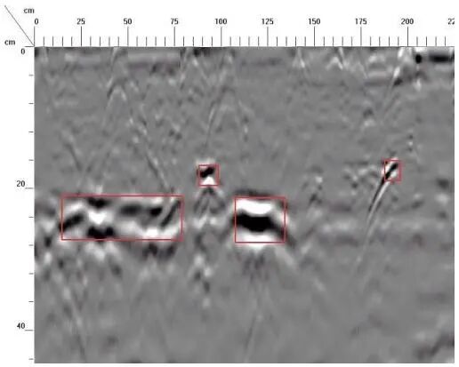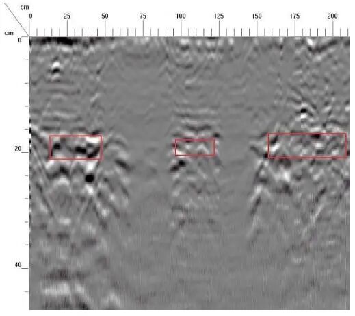 横坐标10~50cm、100~125cm、150~200cm,深度17~21cm位置存在砖墙间灰浆不密实病害