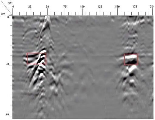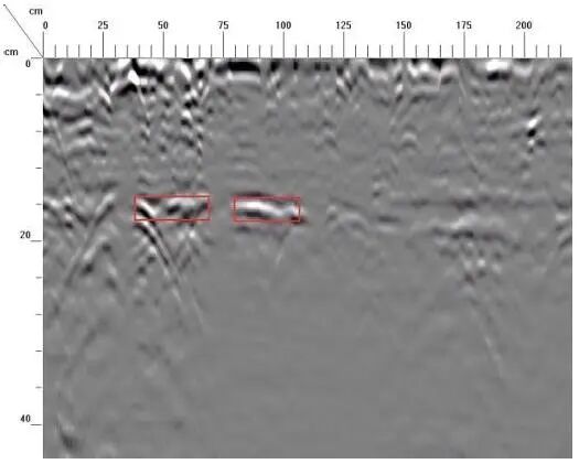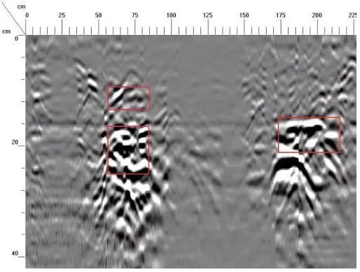 横坐标10~75cm、100~135cm,深度21~26cm位置存在砖墙间脱空、空洞