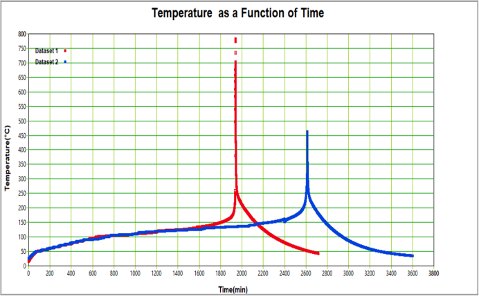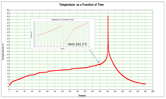 图三 开放环境下锂离子电池的热失控测试T-t曲线