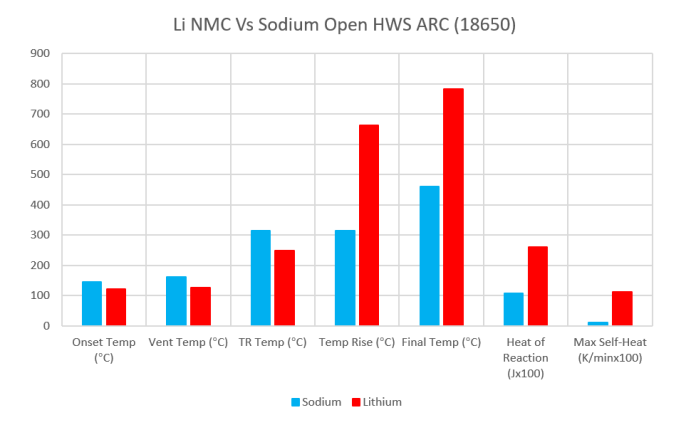 图六 开放环境下钠离子(蓝色)-锂离子电池(红色)热失控特征参数对比